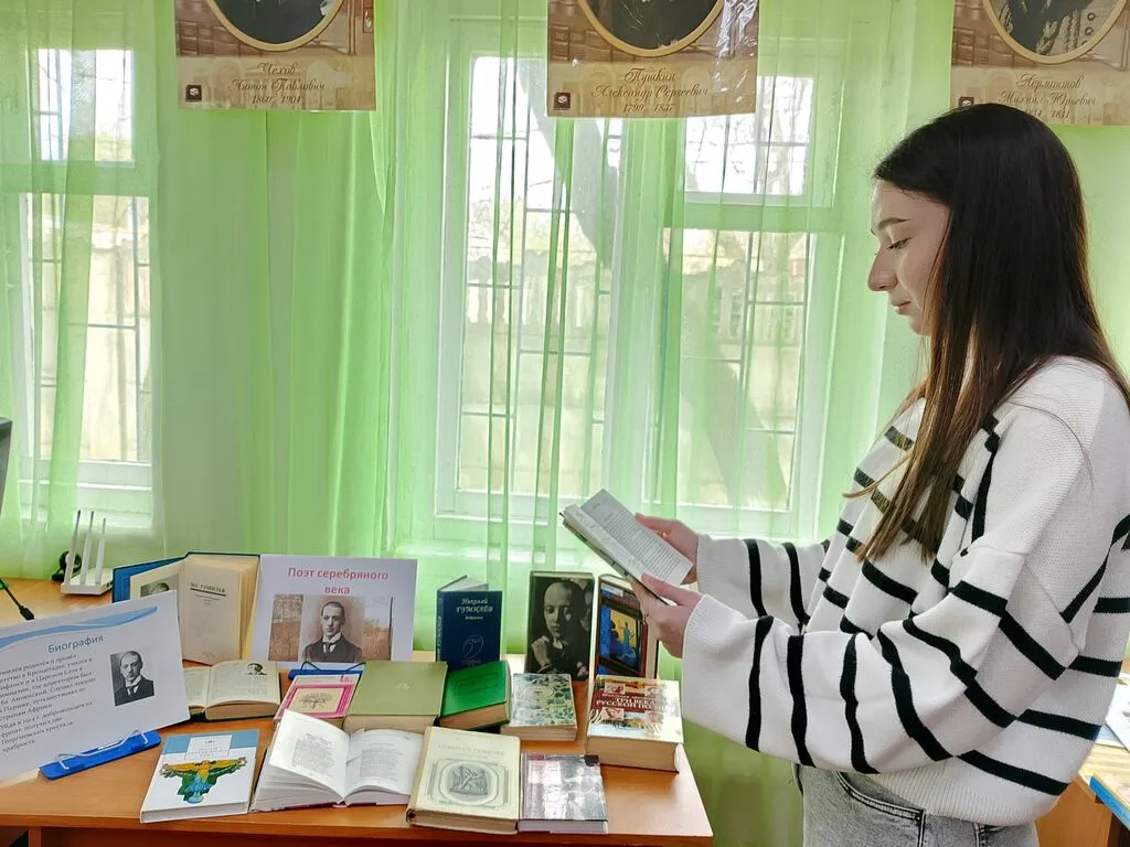 15 апреля, к 140 - летию со дня рождения русского поэта Николая Степановича Гумилёва, в читальном зале отдела обслуживания центральной библиотеки проведён час поэзии «Поэт серебряного века». Библиотекарь пригласила гостей окунуться в поэтический мир Гумилёва – мечтателя и романтика, капитана южных морей, воина и влюблённого рыцаря. Во время мероприятия участники познакомились с наиболее интересными фактами его жизни и творчества с помощью представленной выставки и презентации «140 лет Н.С.Гумилёву». Гумилёв - один из самых читаемых и популярных поэтов России. Его творчество – это география в стихах. Сотрудники библиотеки прочитали стихи «Христос», «Ворота рая». Присутствующие прослушали стихотворения «Молитва», «Ещё не раз Вы вспомните меня», «Ворота рая» и другие, которые представили наши молодые читатели.